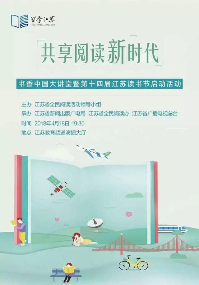 本届江苏读书节的主题是“共享阅读新时代”。在启动活动上,江苏省全民阅读活动领导小组将发布2018年向社会推荐的12本好书、表彰第三届江苏省“书香家庭”、2017“江苏省书香企业建设示范点”、2017年度“江苏省青年书香号”、第二届江苏全民阅读“五十佳”等先进典型。启动仪式后,书香中国大讲堂开讲。你知道开讲嘉宾是谁不?