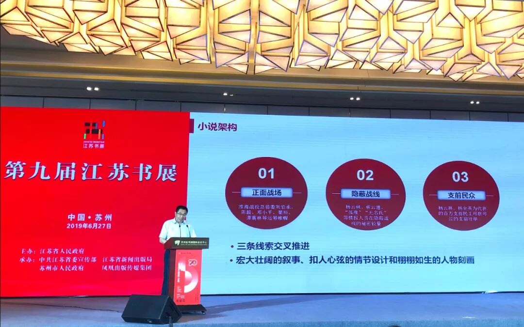 演讲中,张新科从自己创作“英雄传奇三部曲”——《苍茫大地》《鏖战》《渡江》的经历出发,讲述了挖掘红色故事、用笔墨致敬英雄的心得体会。《苍茫大地》《鏖战》《渡江》组成的“英雄传奇三部曲”也是江苏凤凰文艺出版社主题出版板块的重磅新作。