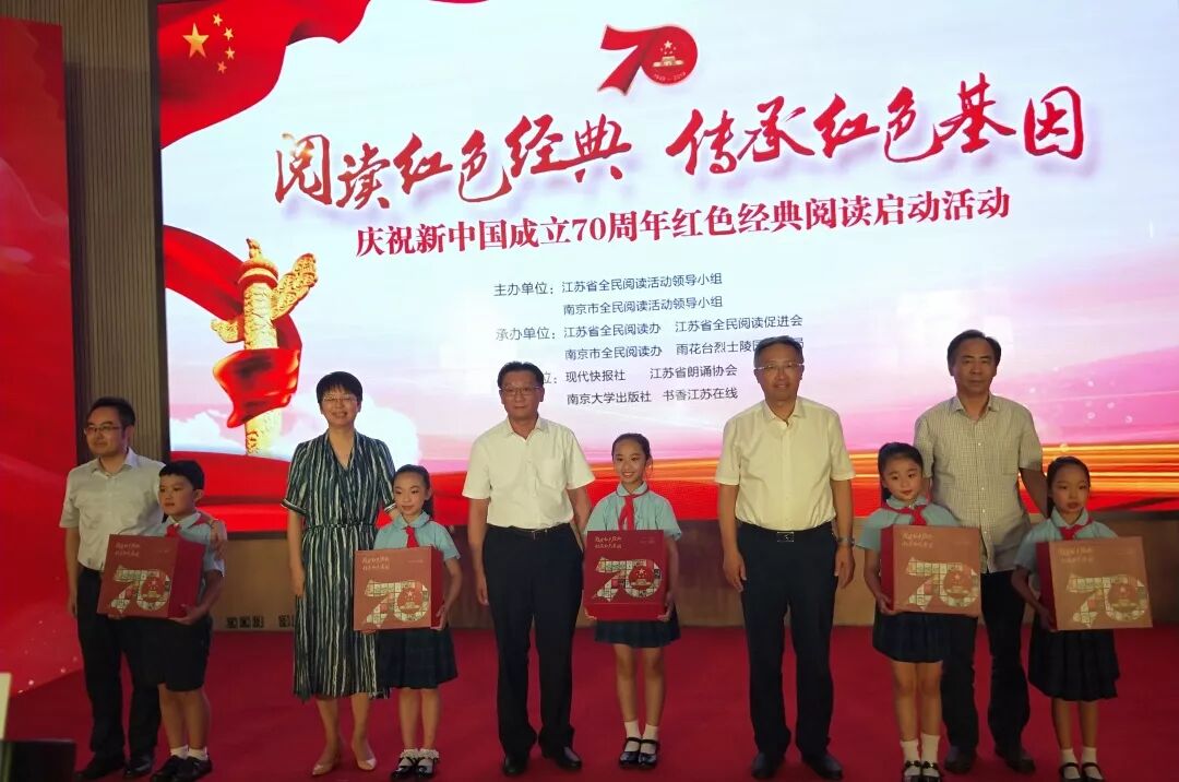 活动现场,江苏省全民阅读活动领导小组发布“庆祝新中国成立70周年红色经典阅读活动荐读书单”,共有特别推荐、党史国史军史、新中国成就、英模人物、红色文学、少儿读物等6个类别70种图书,包括《习近平的七年知青岁月》《习近平在正定》《习近平讲故事(少年版)》《红岩》《初心永恒:江苏四种革命精神简明读本》等。