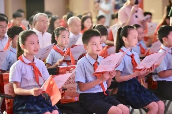江苏省和南京市全民阅读活动领导小组负责人和成员单位负责人向少先队员代表赠送了“红色经典少儿图书”。