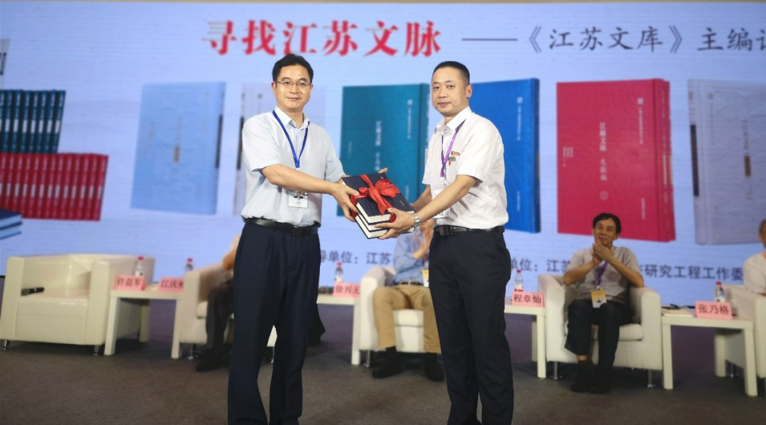 在第九届江苏书展中心大舞台上,《文献编》主编程章灿教授、《史料编》主编江庆柏教授、《精华编》主编徐兴无教授、《书目编》主编姜小青编审、《方志编》主编张乃格编审等五位主编围绕着江苏的历史文化积淀、项目的前期学术积累、省委宣传部的调研立项、编纂与出版团队的搭建、出版规划的拟订等方面,分享了江苏文脉的研究成果,他们身后高大书架上陈列着巳出版新书,全面展示了丰硕的出版成果。活动现场,江苏文脉整理与研究工程工作委员会办公室主任许益军代表编纂和出版方向苏州图书馆馆长曹俊赠送了《江苏文库》。