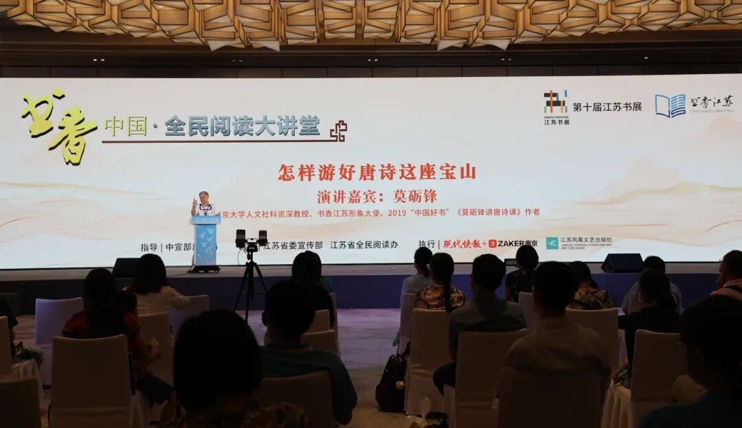 7 月 24 日,作为江苏书展重要的活动,书香中国·全民阅读大讲堂邀请到南京大学人文社科资深教授、书香江苏形象大使、2019年度“中国好书”《莫砺锋讲唐诗课》获得者莫砺锋教授来到苏州,为读者上了一堂叫《怎样游好唐诗这座宝山》的大师课。本次活动由中宣部出版局指导,江苏省委宣传部、江苏省全民阅读办承办,江苏凤凰文艺出版社联合现代快报具体执行。
