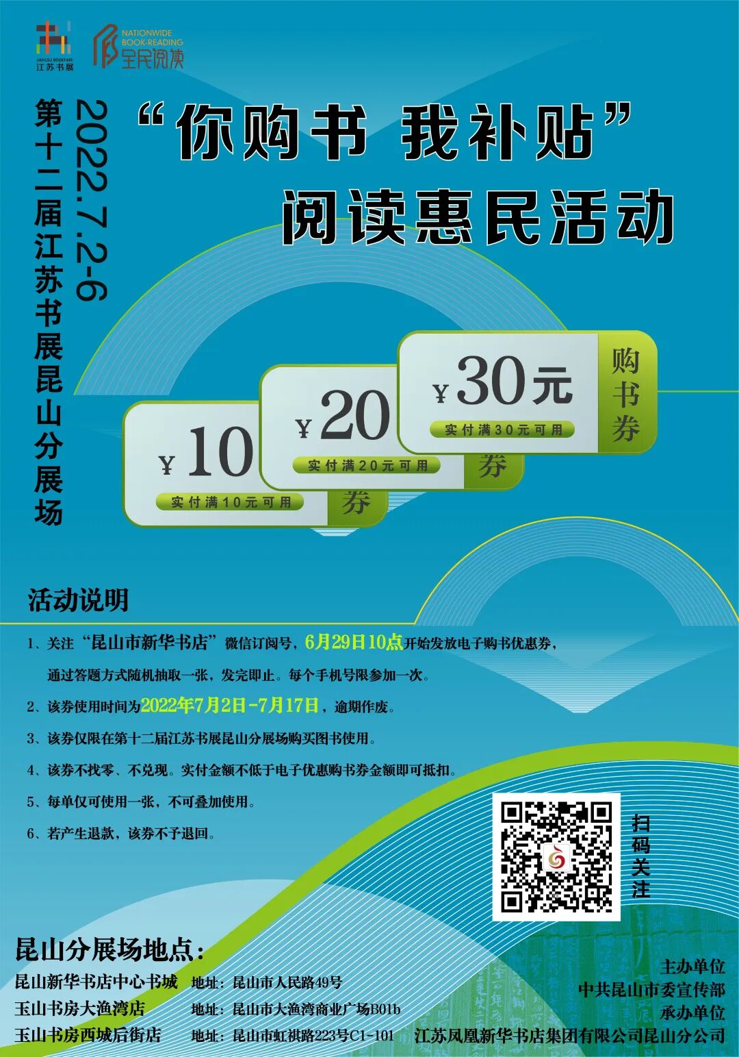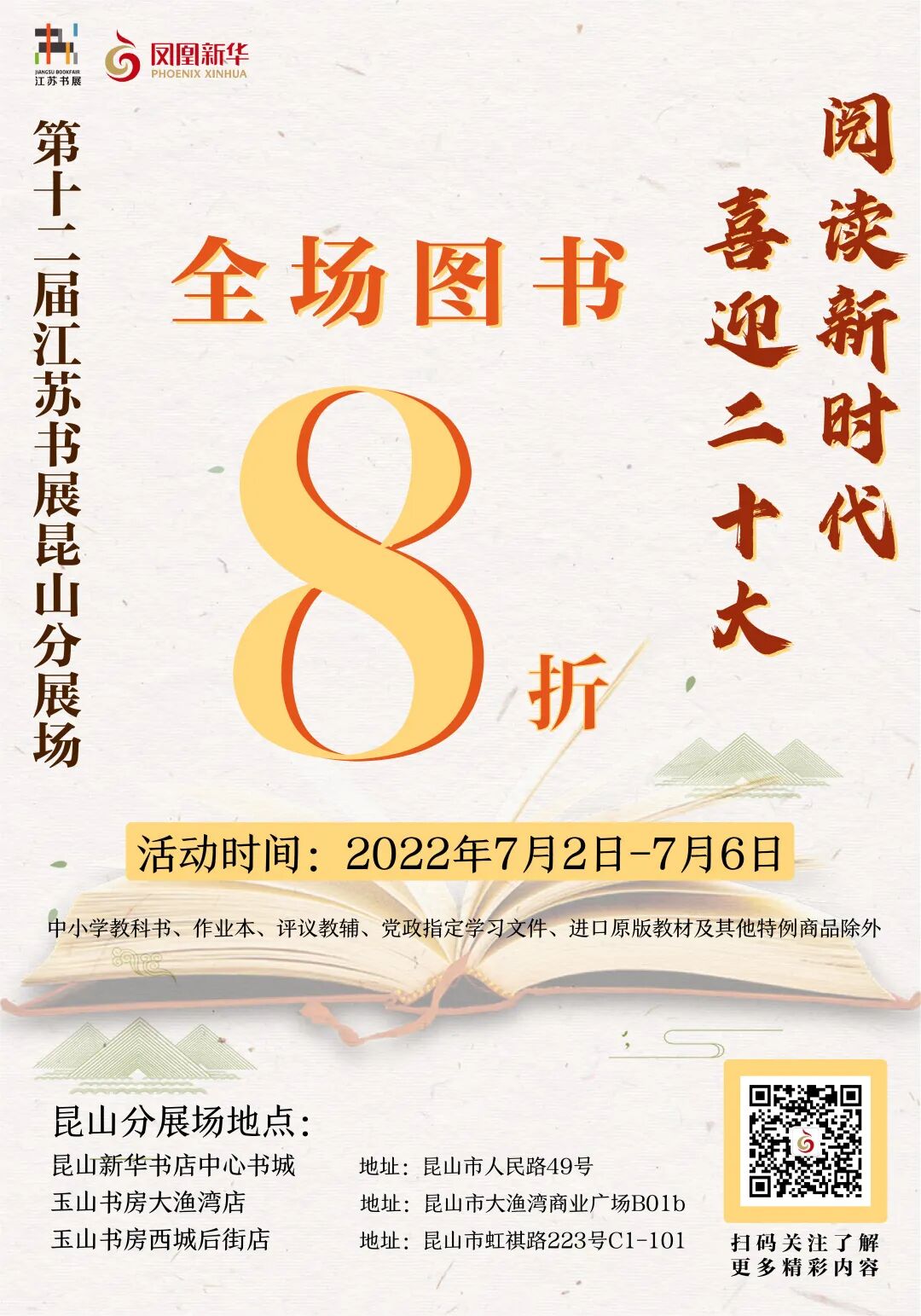 活动内容:第十二届江苏书展期间,昆山分展场全场图书8折优惠(中小学教科书、作业本、评议教辅、党政指定学习文件、进口原版教材及其他特例商品除外)。