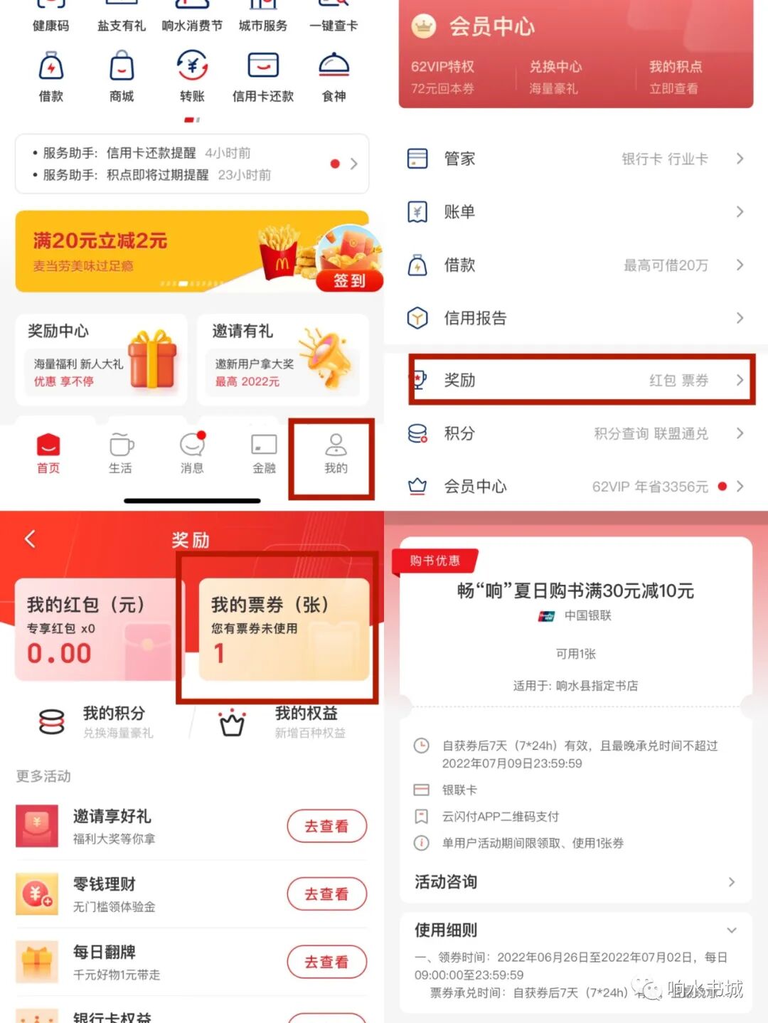 领取成功后,在“云闪付”APP里查看优惠券。领到电子购书优惠券的市民可在6月26日-9月3日期间,至响水新华书店购买图书使用,购书满30元限用一张购书抵用券。抵用券仅作为此活动中消费使用,不可兑换现金,过期作废。