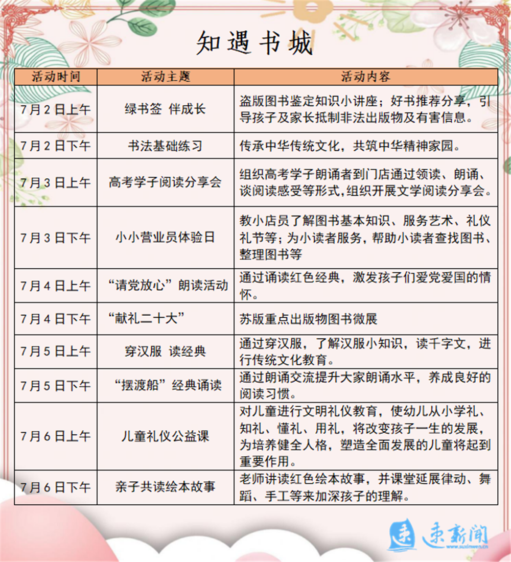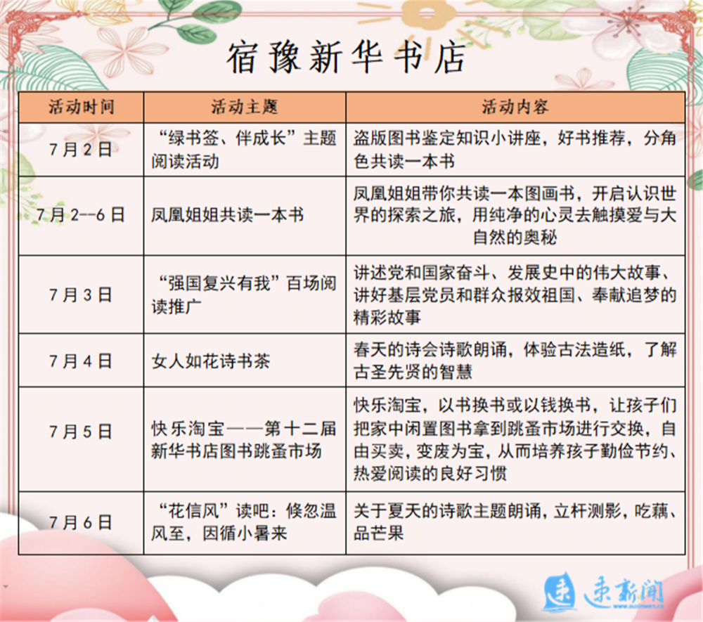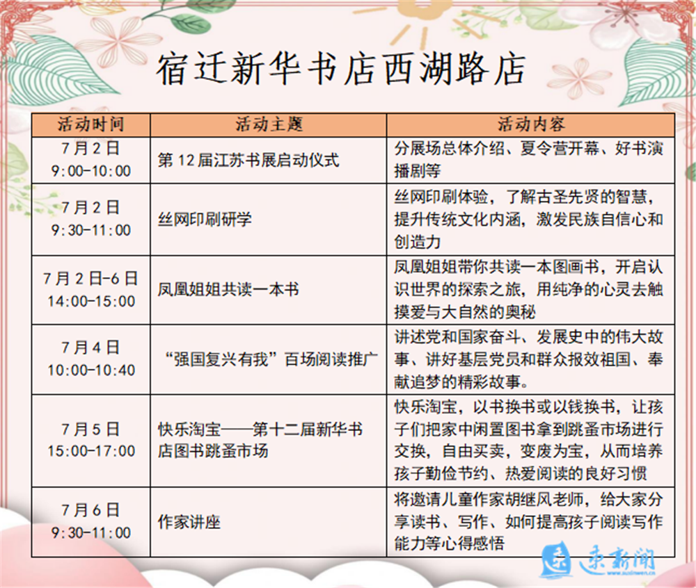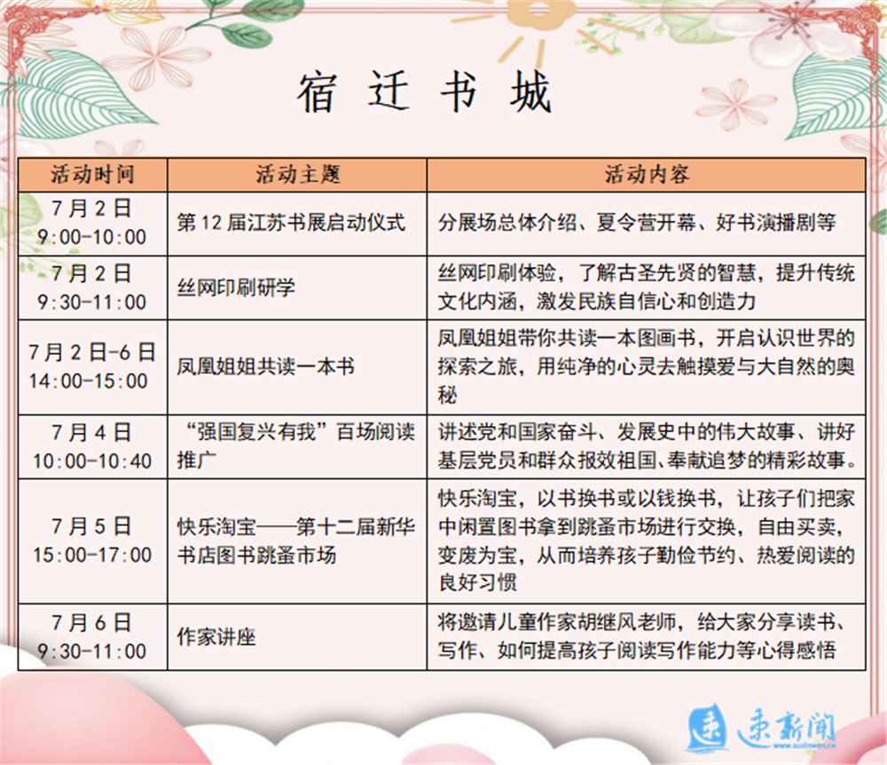 (速新闻记者 周妮)夏日觅书香,不负好时光。7月2日至6日,以“阅读新时代 喜迎二十大”为主题的第十二届江苏书展将于苏州国际博览中心主展场和全省152个线下、两个线上分展场同步举办。据悉,本届书展期间,宿迁将举办形式丰富的分展活动。今年,宿迁将设宿迁书城、宿迁新华书店西湖路店、宿迁新华书店宿豫店等9个分展场,营造浓厚的全民阅读氛围。