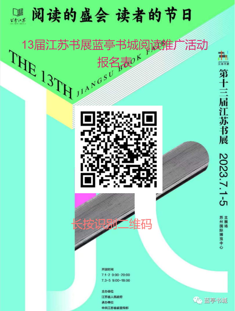 江苏书展是省政府主办,省委宣传部和各地市委宣传部承办的图书盛会,今年已经是第13届了,主会场在苏州,蓝亭书城连续4年成为泰州分会场之一,书展期间,我们策划了多场读书活动,以下是重点活动介绍,参加的朋友扫码文末二维码即可报名。