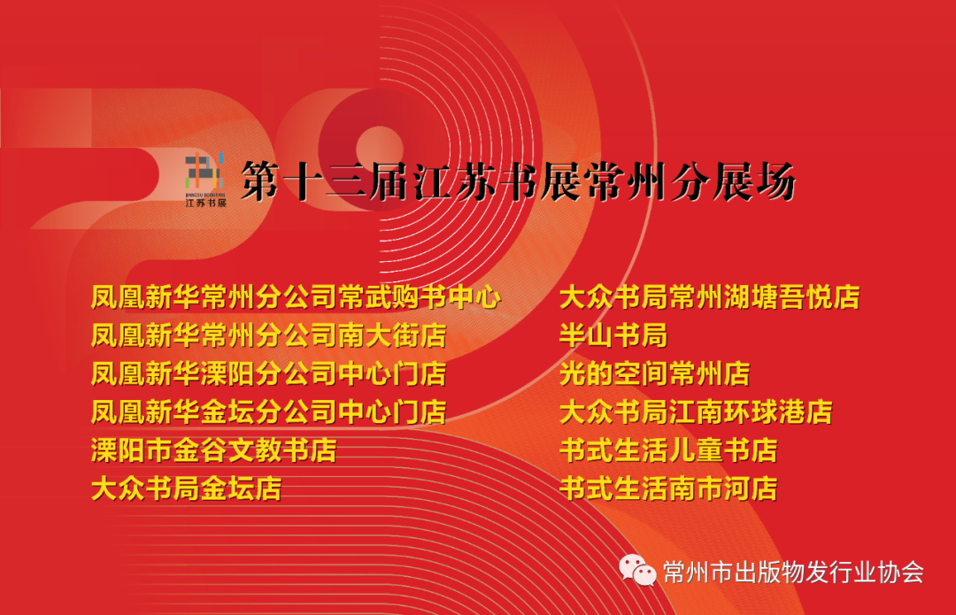 江苏书展是由江苏省人民政府举办的文化盛会,今年是第十三届,今年的书展以“贯彻二十大,奋进新征程”为主题,以“阅读的盛会,读者的节日”为总定位。今年我市设12个分展场,分别是凤凰新华常州分公司常武购书中心、凤凰新华常州分公司南大街店、凤凰新华溧阳分公司中心门店、凤凰新华金坛分公司中心门店、溧阳市金谷文教书店、大众书局金坛店、大众书局常州湖塘吾悦店、半山书局、光的空间常州店、大众书局江南环球港店、书式生活儿童书店、书式生活南市河店。12个分展场将随着今年书展的节奏,于7月1日—5日为广大读者朋友带来一场书香盛宴。为期5天的书展中,我市将开展线上线下优秀出版物展销、全民阅读推广、专题论坛交流、重要信息发布、数字阅读体验、专业展陈展示等127项活动,其中包括25项重点活动,百余场阅读活动也必将在我市掀起新一轮阅读热潮和图书消费热潮。