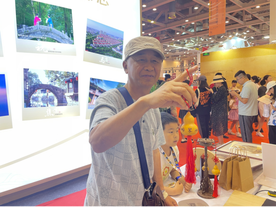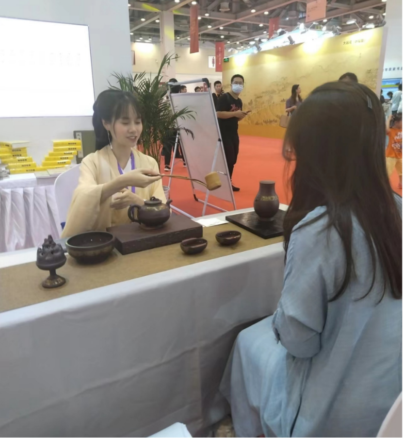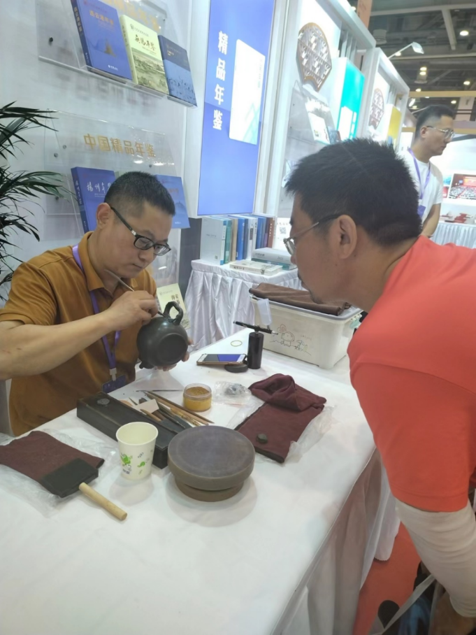7月2日上午,江苏省工艺美术大师谢强,带着他的“中华文明”大型主题紫砂创新项目来到书展现场。一踏入“方志江苏馆”,仿佛穿越时空,来到了古老的紫砂制作工坊。这里展示着各式各样的紫砂茶具,无一不凝聚着它所代表的时代的文化符号,仿佛在静静地讲述着一个个独特的故事。从古至今,紫砂茶具通过匠心独运的制作工艺,演绎着五千年中华文化的辉煌,成为茶文化的代表之一。一位身着传统汉服的少女正在展示紫砂的独特韵律。她手持一壶古朴的紫砂壶,动作娴熟而又优雅。在她的妙手下,壶身发出清脆悦耳的声音,仿佛穿越时光,让人深感那高古浑朴的汉风气韵。观众们不禁为之倾倒,纷纷拍手叫好、拍照留念。