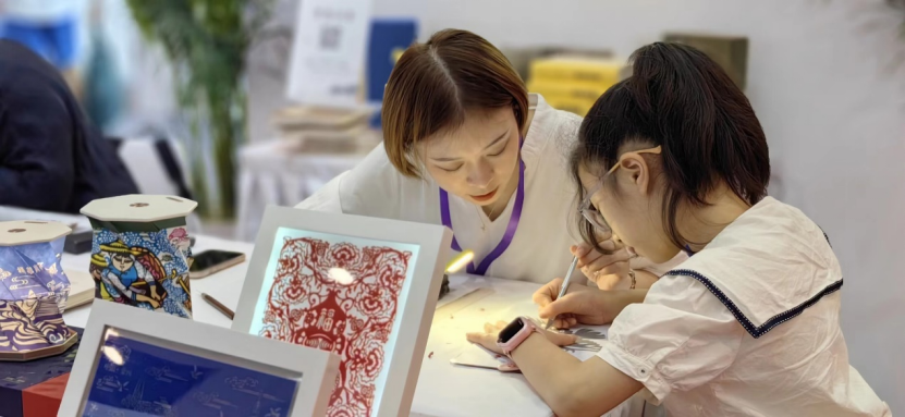金坛手工缠花技艺师姚海霞和吴娟在现场展示缠花技艺,吸引众多观众驻足、观赏、体验。现场许多小朋友和书友在亲自操作缠花工艺后都惊叹,这绕线操作看似简单,真正做起来可一点不容易。缠花工艺的关键点在于“缠”,讲究缠功,有一句老话叫“缠花妙不妙,全在手牢靠”。精美缠花的背后凝聚的都是技艺师的匠心和巧思。活动现场还赠送了20份刻纸给爱好者和书友们。