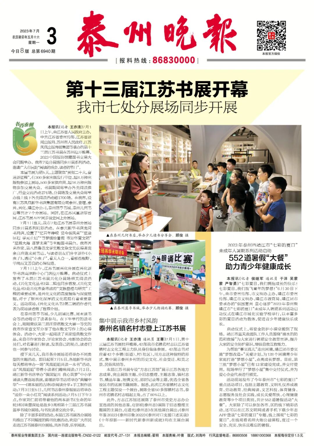 本届书展为期5天,主题聚焦“贯彻二十大,奋进新征程”,有300多家出版发行单位、超8万种出版物参加主展场,500多家供应商、超16万种出版物参加交易大会。书展期间将举办各类阅读推广、行业交流活动274场,分展场及交易大会将举办线上线下各类阅读活动超1700场。在我市,设有江苏凤凰新华书店集团有限公司泰州、姜堰、泰兴、兴化、靖江分公司,泰州蓝亭书城、泰州几何书店等共计7个分展场。同时,在江苏凤凰新华官网、江苏书展APP同步设立网上分展场。