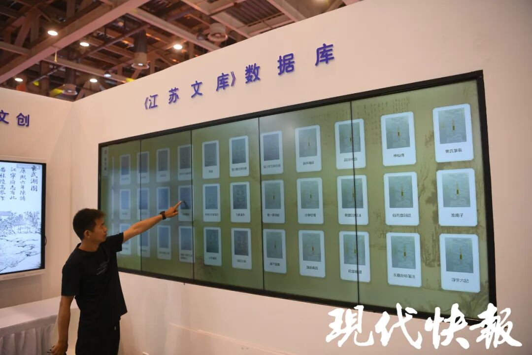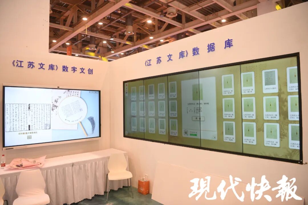 在江苏书展的数字阅读馆,就特别设置了《江苏文库》数据库的“瀑布屏”。5块大屏拼接在一起,屏幕上的内容从左到右不断滚动。