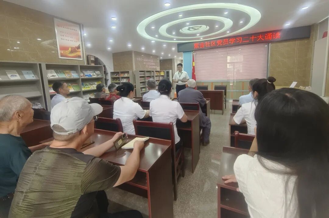 中阳里街道紫金社区组织党员开展二十大诵读活动。“江山就是人民,人民就是江山;中国共产党领导人民打江山、守江山,守的是人民的心。”社区支部书记张帅带头诵读,激情澎湃的诵读,让党的声音在全场回响,让二十大精神深深印入在场每一名党员的脑海中。