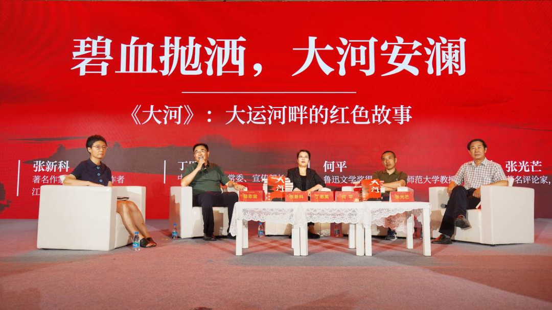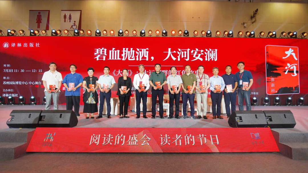 7月3日,著名作家、江苏省社科联党组书记张新科携新作《大河》做客第十三届江苏书展,与中共江苏省徐州市贾汪区委常委、宣传部部长丁思英,鲁迅文学奖得主、南京师范大学教授何平,著名评论家、南京大学教授张光芒,共话“运河支队”的传奇故事。在场的一百多位读者和观看网络平台直播的五百多万观众共同见证了《大河》新书首发。