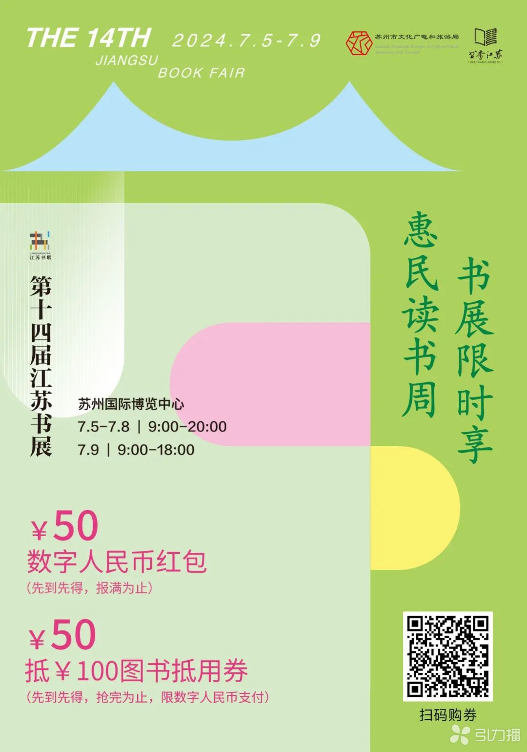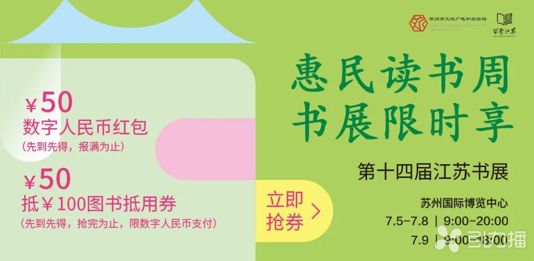 6月28日10:00起,苏州市文广旅局将在“君到苏州”平台上线“惠民读书周 书展限时享”活动,精准发放文化消费补贴,全社会共享阅读好礼。本次惠民读书券发放分为数字人民币红包和数字读书券2种形式,领取后可在第十四届江苏书展现场购买图书时使用,实际使用细则以现场为准。市民可长按识别下方二维码,进入“君到苏州”平台“惠民读书周”专题活动页面注册,领取50元数字人民币红包,或用50元购买100元数字读书券,每位用户限领(限购)一份。