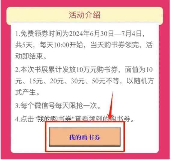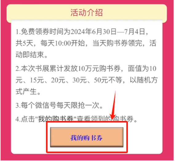 免费购书券领取时间为2024年6月30日—7月4日,每天10:00开始发放,当天购书券领完,活动即结束。