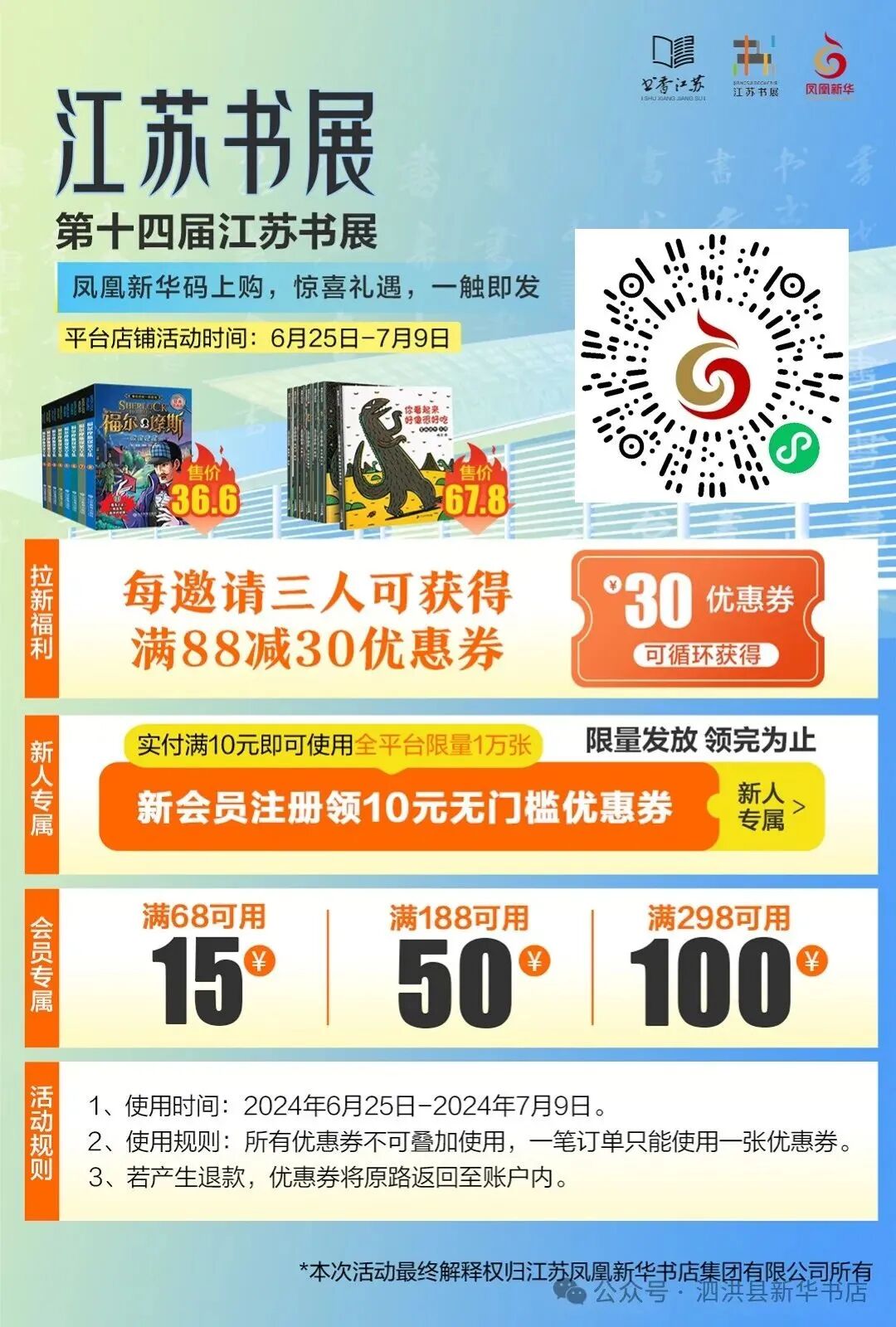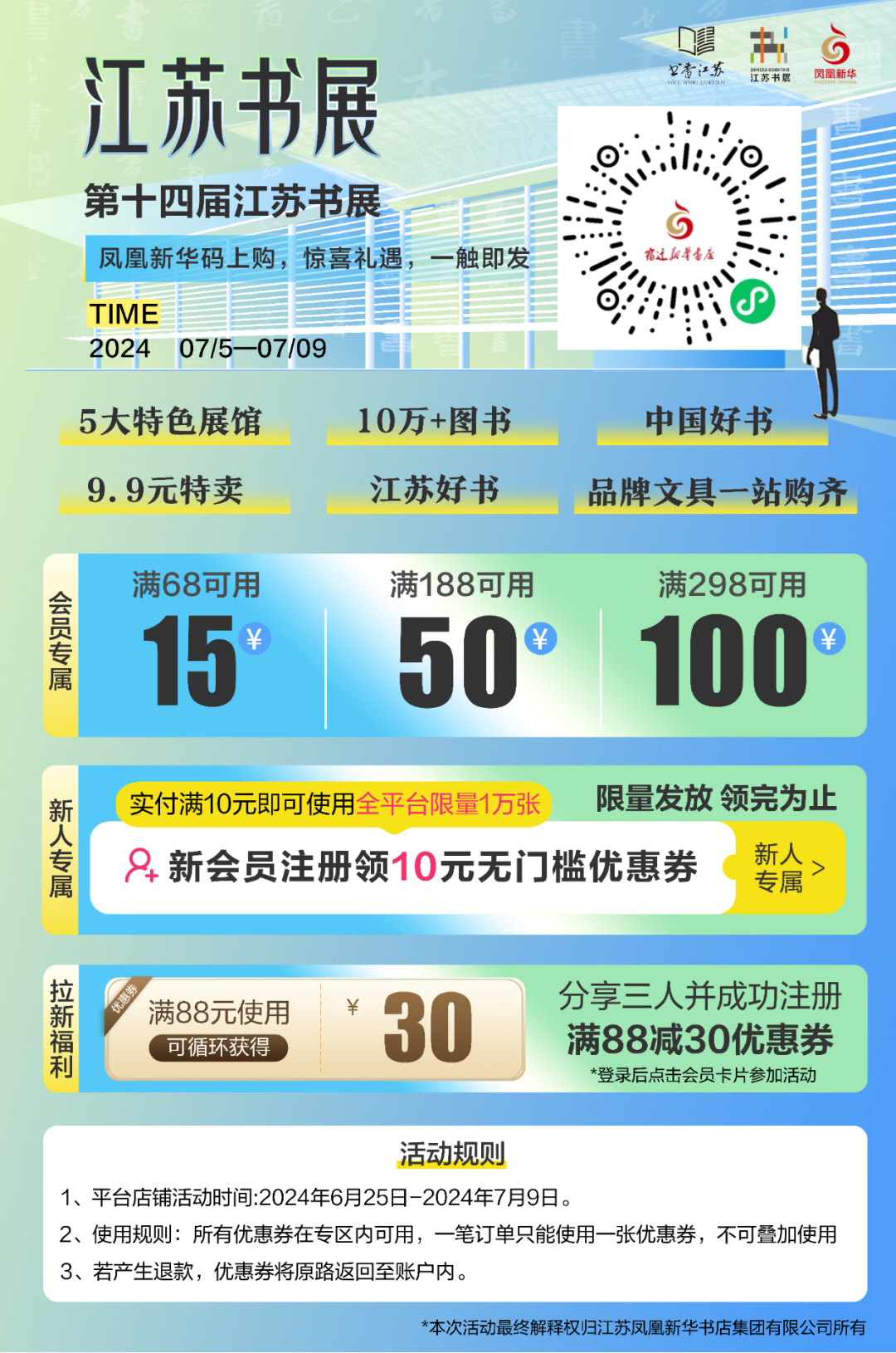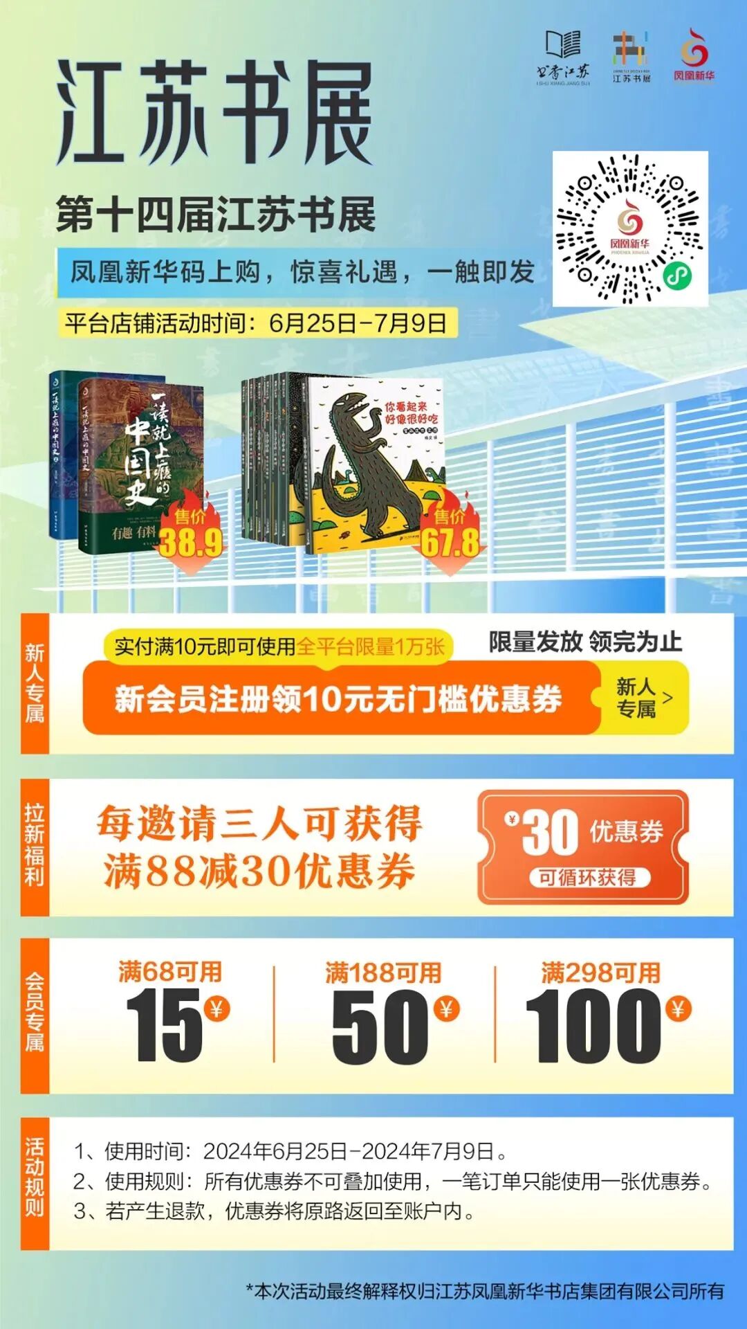 7. 第十四届江苏书展期间,凤凰新华码上购,惊喜礼遇,注册即可领取优惠券,满68可使用15元、满188可用50元、满298可用100元。