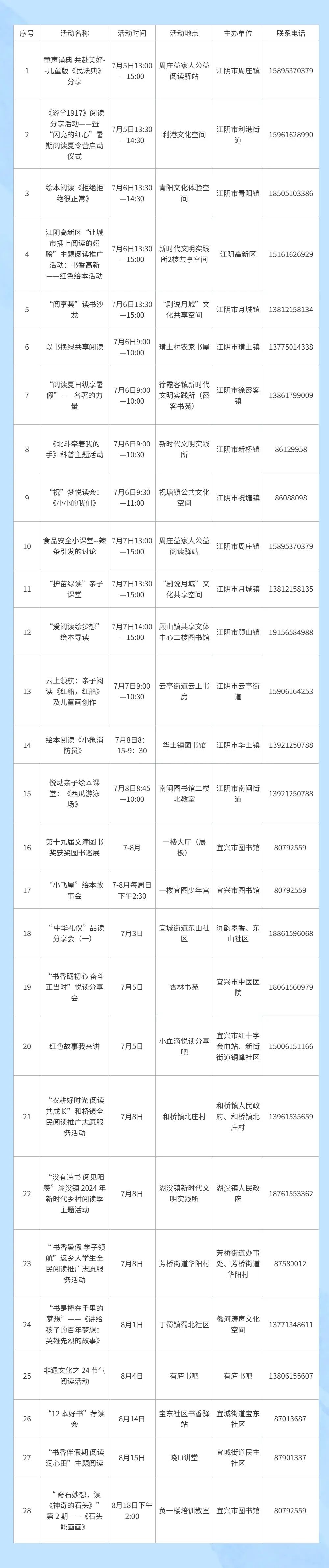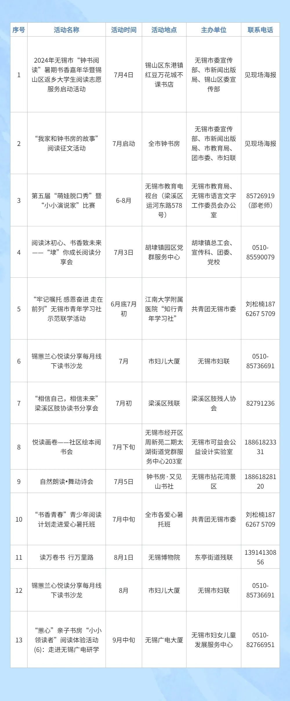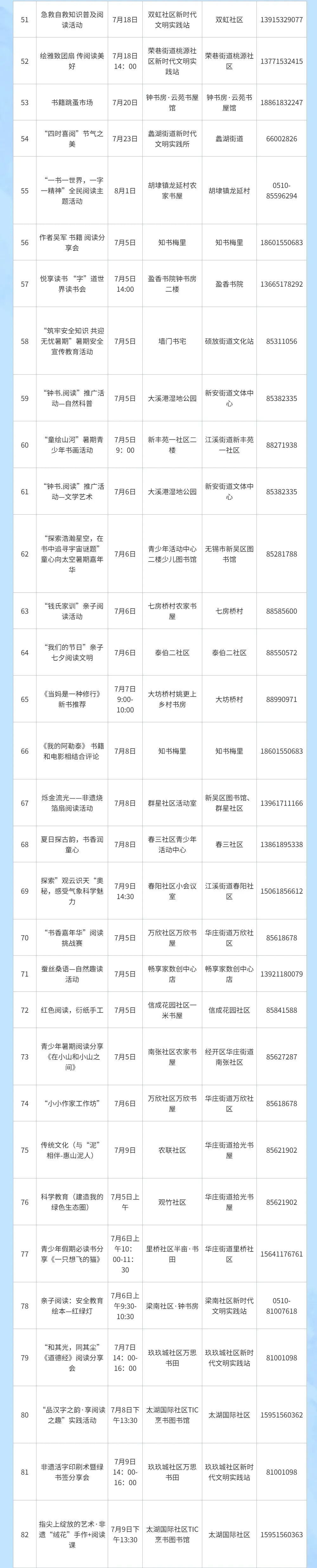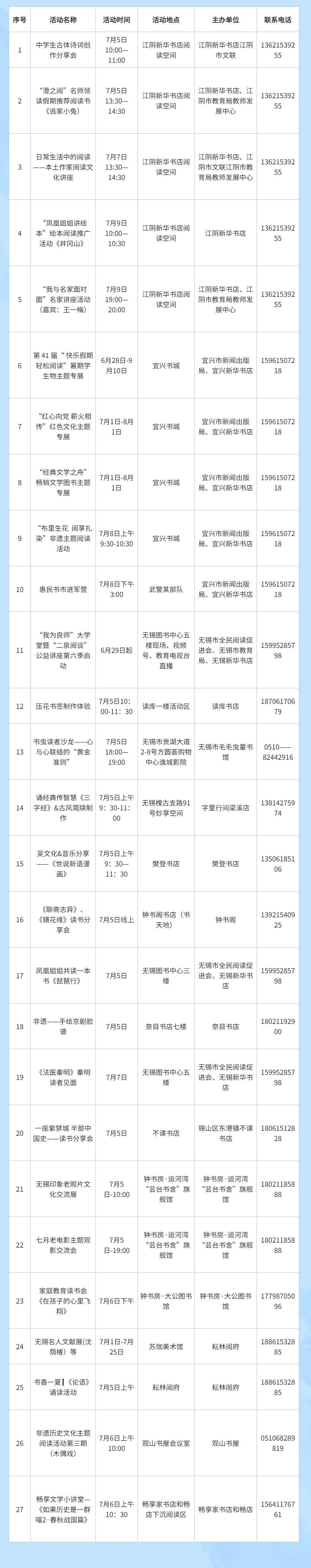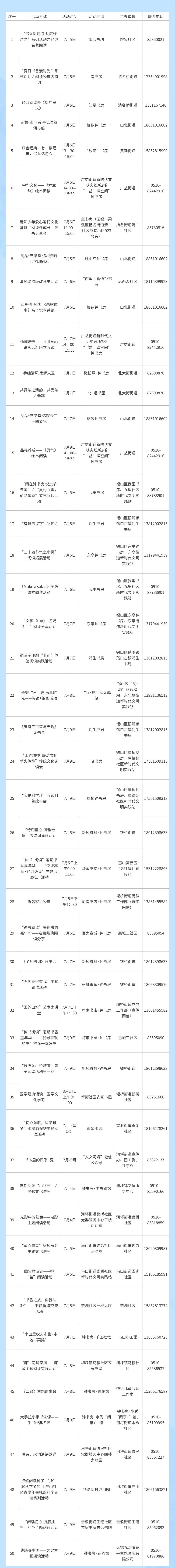 今年暑期,我市将举办1200余场公益阅读推广活动,江阴、宜兴的公共阅读空间,无锡城区所有“钟书房”,每天至少一场公益阅读活动,规模空前。“以前要到苏州赶江苏书展,现在,我们无锡人在家门口就能参加阅读盛会。”书迷胡先生感叹道。