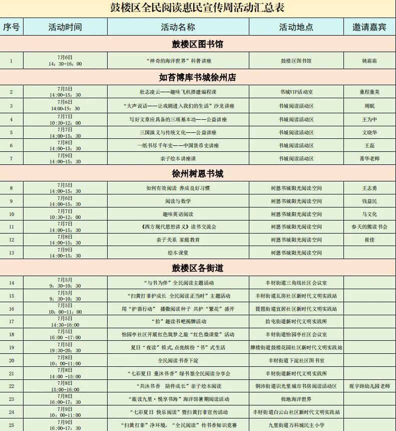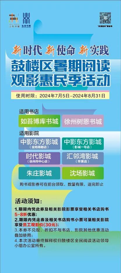 此外,鼓楼区还在此次售书周活动期间举办暑期观影惠民季活动,市民可在如苔博库书城、徐州树恩书城及6家相关影院前台领取“鼓楼区全民阅读暑期购书观影券”参加相关活动。