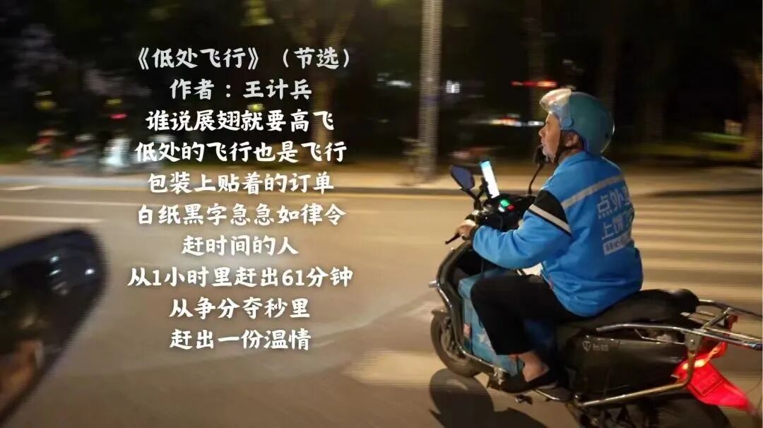 王计兵的经历和作品被央视新闻、新华社等百余家媒体广泛报道、重磅推荐,也被千万读者传诵和喜爱,人们称其为“外卖诗人”“来自底层中国的行吟诗人”,赞其作品为“真正劳动者的诗歌”。这之后,他停了停,整理思绪,在今年早些时候出版了最新诗集《低处飞行》。