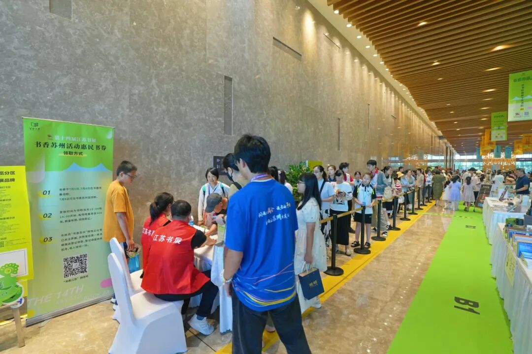 为进一步推动全民阅读热情,打造更加浓厚的阅读氛围,本届江苏书展上,苏州市委宣传部推出书香苏州活动惠民书券,于现场发放。在书券领取台前,读者早已排起了长龙。本次将发放总金额为10万元的书香苏州活动惠民书券,每张书券面值20元,共5000张。领取到的书券可在书香市集和书香苏州馆内使用。