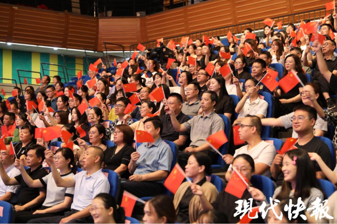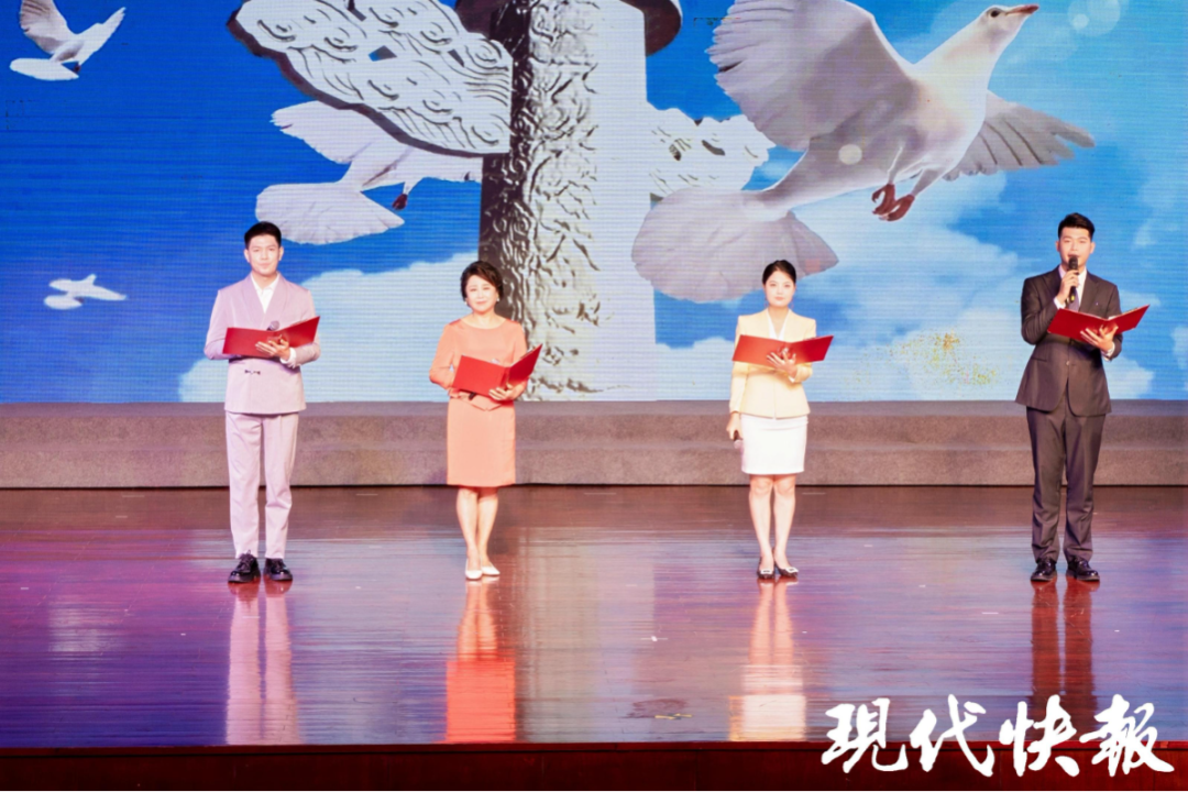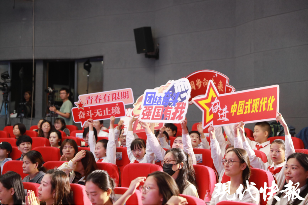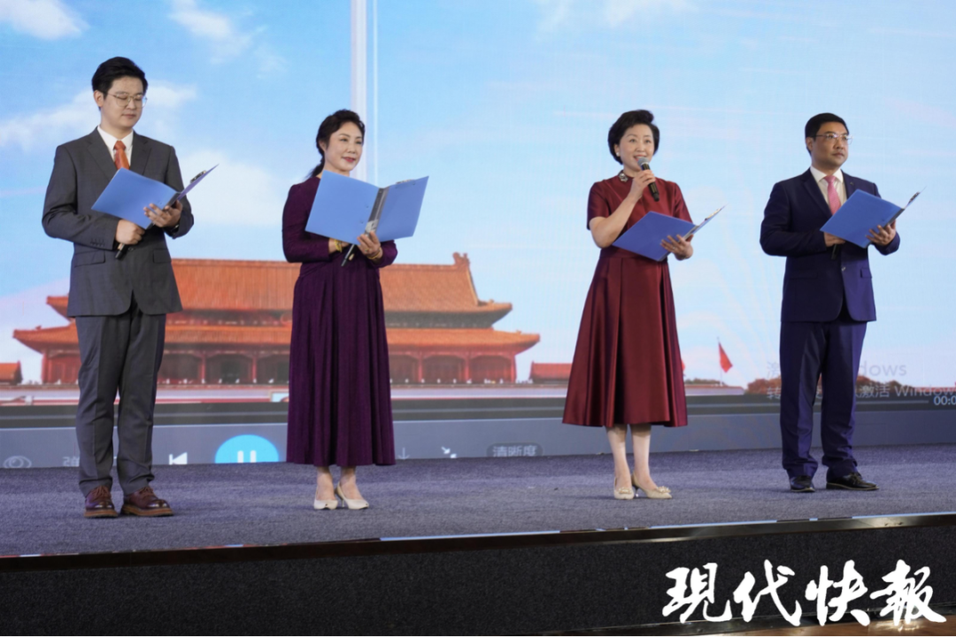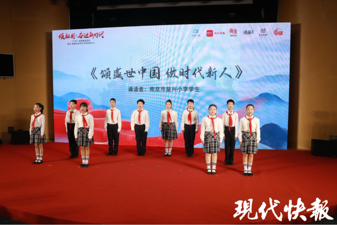 活动现场,南京市复兴小学学生带来群诵《颂盛世中国 做时代新人》,礼赞伟大祖国,传递好好学习、奋发向上、争做新时代好少年的信心和决心。南京师范大学学生激情诵读了《青春中国》,带领线下线上的观众,聆听新时代的脉搏,感受国家日新月异的进步与发展。南京市复兴小学教师、南京市鼓楼区图书馆工作人员朗诵雨花英烈诗词——恽代英的《我》、袁国平的《别了,三年的皖南》、邓中夏的《胜利》,缅怀先烈的铮铮铁骨,感悟信仰的力量。南京市宁海中学高中部“曾联松国旗护卫队”成员诵读了宁海中学校友、国旗设计者曾联松写的《入选吟》。