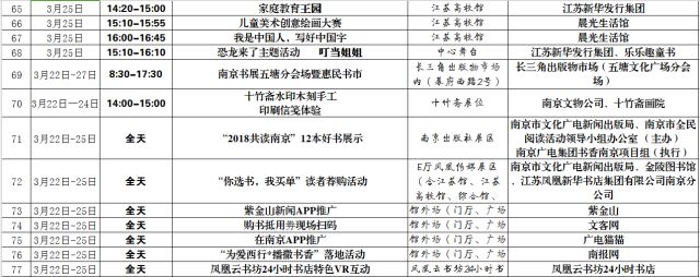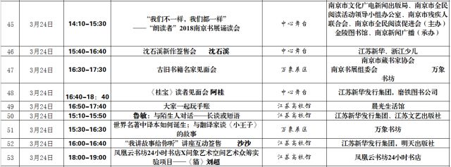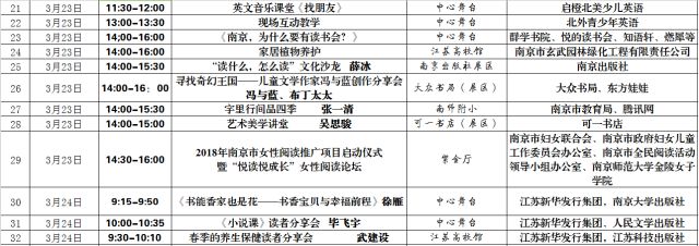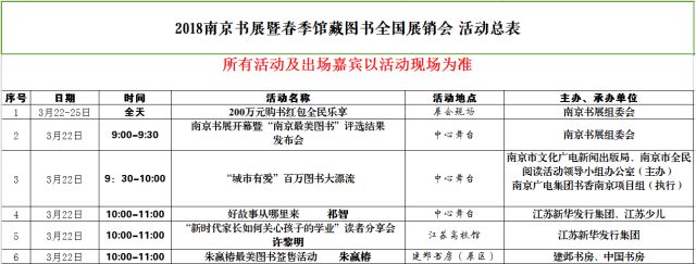2018南京书展将于3月22号举办。这是一次读书人、爱书人、写书人的盛会!这两天有不少朋友特别是家有孩子的父母们,都在向我咨询南京书展的具体活动安排,想带娃们去见见他们心目中的作家偶像,带孩子们去现场感受书香。嗯,我这里刚好得到了一份南京书展的活动安排表,在这里发给大家,供大家参考!