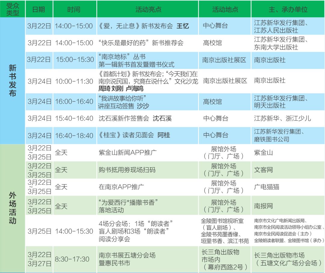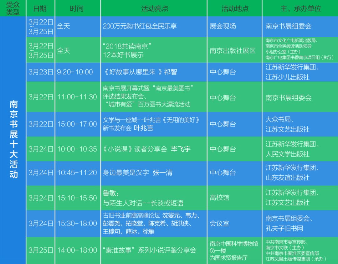 【三】南京书展开幕式暨“南京最美图书”评选结果发布会、“城市有爱”百万图书大漂流活动 书展首日,经过专家评选的“南京最美图书”将面向社会公布,想要抢先欣赏到这批南京元素的最美图书么?做好笔记:3月22日,11点整,中心舞台! “南京最美图书”遇见最美的你 ,“城市有爱”百万图书大漂流公益活动随后也将启动,通过南京书展的大舞台,以书为载体,传递知识,传递城市的温暖!